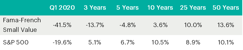 The Fama-French Small Value Index fell over 41% this quarter, the worst quarterly performance on record (with the record extending back to 1926). This sharp drawdown makes this the worst 10-year run for small value stocks since the Great Depression. Below, we show the trailing returns of the Fama-French small value index and the S&P 500.